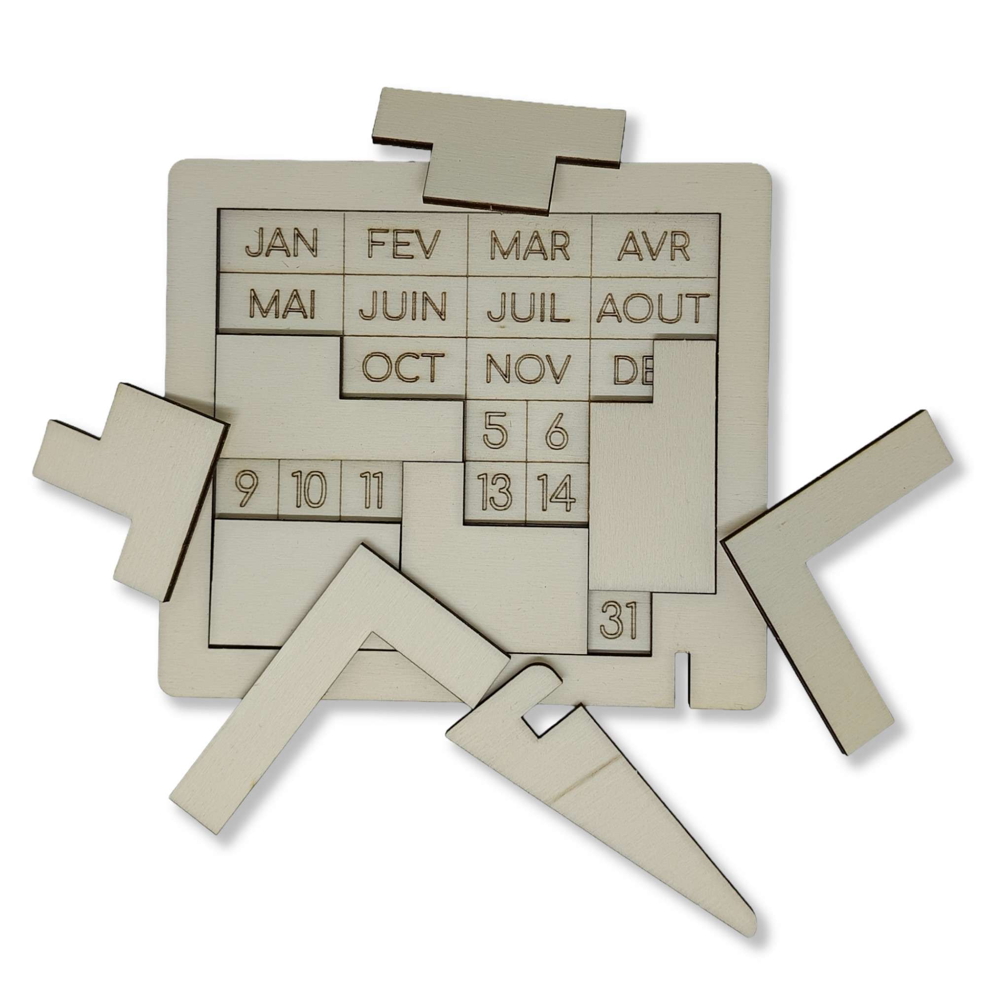 Avec ses 8 pièces à assembler, ce puzzle calendrier vous met au défi de trouver la bonne configuration tout en laissant apparaître la date du jour. Chaque jour apporte une nouvelle combinaison à résoudre.